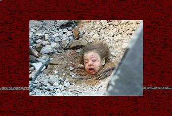 tronc, ou sans jambes, voire sans tête - l'image de ce petit garçon sortant de l'école bombardée avec dans les bras le corps de sa soeur décapitée, vous ne l'avez pas vue ??? - , des enfants