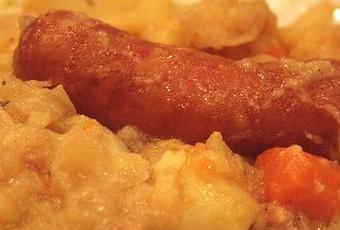 Emincez l'oignon et faites le revenir dans le beurre dans une cocotte-minute assez grande pour tout contenir. Rajoutez les lardons, et les saucisses, pour les faire dorer un peu. Rajouter la gousse d'ail écrasée et le thym émietté. Rajoutez le chou, les morceaux de légumes choisis, mélangez.
