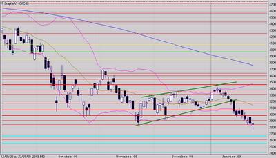 "...l'objectif des 2670 points sera à considérer, mais il est probable qu'en chemin, une nouvelle tentative de rebond ait lieu. Celle-ci devrait se situer dans la zone des 2750 à 2800 points."La conclusion d'hier a bien été vérifiée ce jour avec une franche rupture du support des 2848 points et un rebond en séance démarré sur les 2770 points!