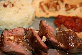 Couper les filets d'agneau en fines tranches puis les disposer dans les assiettes.