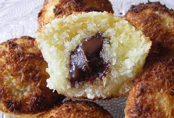 Voilà de délicieux petits gâteaux façon “rochers congolais” (cliquez pour la recette des congolais) mais avec des oeufs entiers et…fourrés au chocolat. Une vraie petite tuerie !