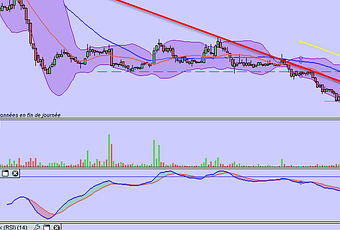 Vue hebdomadaire pour Rue du commerce. Malgré un milliards d’internautes dans le monde dont 34 millions en France dont 22 millions d’acheteurs sur le net, Rue du Commerce poursuite sa chute. Cependant dernièrement le titre semble avoir trouvé un support pour rebondir, mais ce rebond reste encore qu’un rebond technique. La grosse oblique descendante en rouge sur le graphique reste seul arbitre de la tendance. Il faudra attendre que Rue du commerce se décide de la casser à la hausse pour pouvoir parler de reprise haussière durable. En attendant, la tendance court terme ne permet pas de se placer. Le RSI est quant à lui, toujours bloqué également dans un trend baissier, la cassure de ce trend à la hausse sera également un signal d’achat. Les volumes sont absents malgré que le macd ait cassé à la hausse sa moyenne. Il faut donc patienter encore quelque peu le temps d’avoir un peu plus de chandeliers pour se décider, le rattrapage aura lieu d’ici fin mars et devrait porter les cours sur les 5€.