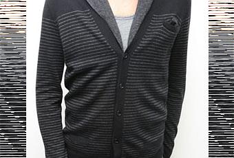Ainsi, lorsque je suis rentrée dans une boutique The Kooples, c'était tout d'abord pour mon Homme. Je lui ai dégoté un petit cardigan rayé avec un col chale en trompe l'oeil. Il faut dire que le visuel sur le site internet de la marque ne met pas forcément en confiance. Le mannequin porte le cardigan très (trop) près du corps.