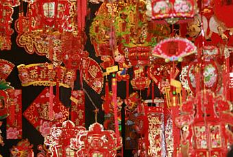 Plafonds tapissés de lanternes. Rouges. Murs recouverts de poissons. Rouges et or! Lingots de papiers rutilants. Marmots joufflus habillés de pourpre au cœur de losanges à afficher sur la porte d’entrée.