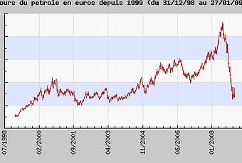 Source sur l'excellent http://lalisterose.com/index.htmlVoilà la vérité en bon Européen, en euros donc, c'est de 90 € à 30 € qu'il a chuté le "baril", et depuis fin 2006 il a évolué entre 40 € et 90 €.