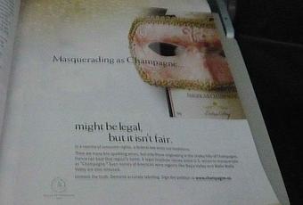 Ce n’est pas la première fois que l’on mentionne l’appellation champenoise, ni ses difficultés à se faire respecter dans le monde entier et nous avions consacré un précédent article à l‘accord intervenu entre l’Union Européenne et l’Australie. Le Comité Interprofessionnel des Vins de Champagne (CIVC) espère qu’un jour le nom de Champagne ne sera plus associé qu’à la boisson originaire de la région de Reims, et non utilisé à tort et à travers pour désigner tout vin pétillant. On sait déjà que le combat n’est pas gagné d’avance, mais voici la nouvelle initiative champenoise : une publicité dans le magazine d’une compagnie aérienne américaine (US Airlines, pour ne pas la nommer).