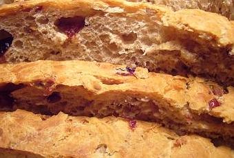 Voici une très bonne recette de pain qui vient du livre Home baking. J'ai remplacé les abricots secs et les noix de la recette originale par des cranberries sèchées et des noix de pécan. Très bon servi en tranche avec de la confiture de fraise (d'après Serhan).
