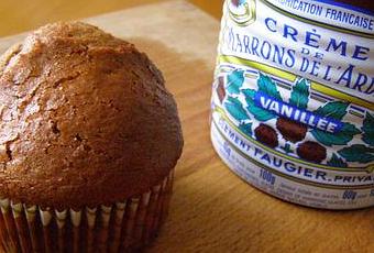 Prenez vos moules à muffins et y déposer 1 c à s de pâte. Mettre par dessus et au centre 1 cuillère à café de crème de marron et finir de remplir jusqu'au 2/3.