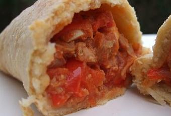 J'en ai confectionné 8 grosses, au lieu de 10 ou 12 comme Eryn, ce qui donnait des "chaussons" de taille très acceptable. N'ayant pas de poivron vert dans mon panier à provision, j'ai décidé de rester dans le rouge, et de les faire uniquement avec des ingrédients de cette couleur, omettant donc les petits pois. C'est une recette que je testerai à nouveau sans doute, par ce que le résultat est excellent et parce que j'aimerais voir ce que donne la recette complète ... avec du rouge et du vert.