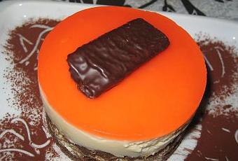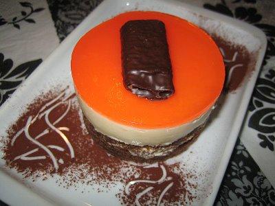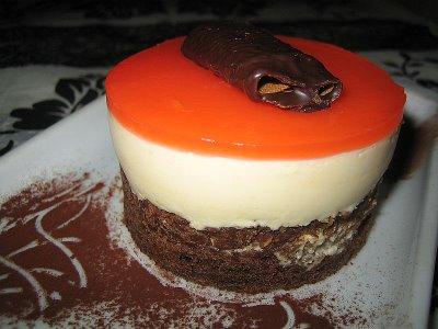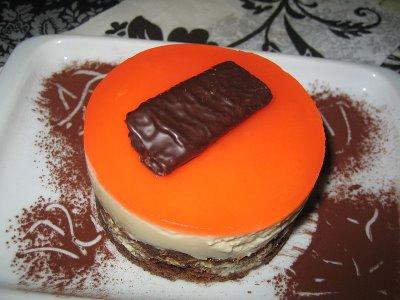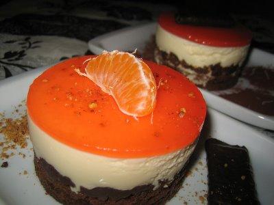 Presser 2 oranges , ajouter un peu de sucre ,et deux feuilles de gélatine ramollies et essorées.Verser cette préparation sur les mousses et remettre au congélateur 2O minutes et puis 4 heures au frigo, ou mieux toute la nuit!