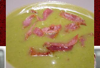 Rincez les pois cassés à l’eau froide jusqu’à ce que l’eau soit propre et égouttez. Dans une grande casserole, faites chauffer la 1/2 cs d’huile et faites blondir l’oignon environ 2 minutes. Ajoutez les pois casés et la pomme de terre. Mouillez avec l’eau (ajoutez le cube), couvrez et laissez mijoté 1 heure 30 environ. Salez et poivrez. Incorporez les petits pois dans la soupe et laissez cuire encore 5 minutes. Passez la soupe au mixeur, jusqu’à ce qu’elle soir lisse. Dans une poêle faites chauffer l’huile restante. Coupez le jambon et le bacon en lanière et faites le dorer. Servez le velouté et parsemez de jambon et bacon grillés.