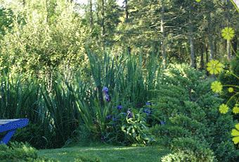 Depuis cette chaise bleue on peut observer une rocaille où se mélangent de nombreuses vivaces comme les iris, les centaurées, les galliardes, les corbeilles d'argent, les népétas et nombreuses autres variétés. Ce petit coin, au pied d'un immense érable, offre une vue sur l'ensemble du jardin et permet de découvrir le spectacle que nous offre la nature.
