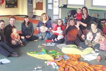 Janvier 2008, Saint Laurent de la Salanque, Association Berlingot, Atelier Signe avec moi, activités. Elle est vraiment chouette cette photo, les participants se reconnaîtront : Sonia, Marie-Laure, Florence, les deux Magali, la maman de Magali, Hélène, Mélanie, Coralie et deux papas, Christophe et Benoît, ainsi que les petits bouts.