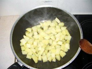 Eplucher et couper les pommes de terre en dés moyens. Les cuire 5 minutes à la vapeur. Eplucher et émincer l'oignon. Le faire revenir dans une grande poêle, avec une bonne rasade d'huile d'olive chaude. Ajouter les pommes de terre et les faire revenir tout doucement. Ajouter le persil ciselé. Tenir au chaud.