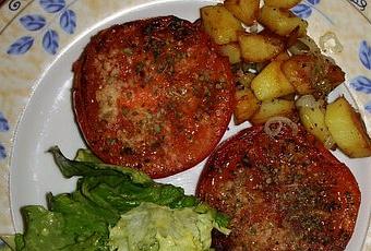 Laver et couper les tomates en deux. Les faire revenir dans un peu d'huile d'olive chaude côté chair d'abord. Au bout de 2 ou 3 minutes, les retourner et les parsemer d'herbes de Provence et d'ail pressé. Laisser cuire entre 3 et 5 minutes. Les retourner à nouveau côté chair pendant 30 secondes le temps de saisir légèrement l'ail.Assaisonner la salade et bien la touiller. (Important le touillage. Toute la réussite d'une bonne salade réside dans le touillage, je ne le dirai jamais assez.)
