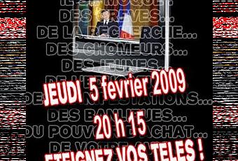 OPERATION JEUDI NONJeudi à 20h15ETEIGNEZ VOS TELES ! N'ecoutons plus Sarkozy en direct !N'ecoutons plus Sarkozy en direct !N'ecoutons plus Sarkozy en direct !N'ecoutons plus Sarkozy en direct ! il se moque :des greves...de la recherche...des chomeurs...des jeunes...de l'education...des manifestations...des banlieues...du pouvoir d'achat... de votre avis...des flics...du parlement...des hopitaux...de toi !