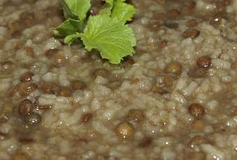 Faire revenir l'oignon émincé dans le beurre et l'huile, ajouter 4 verres d'eau (vérifier et en rajouter éventuellement), les lentilles, laisser cuire 1 heure. Ajouter le riz, le cube de pot au feu et le cumin, saler, poivrer et poursuivre la cuisson 1 heure. Servir dans des bols avec des croûtons et des petits radis pour manger avec.