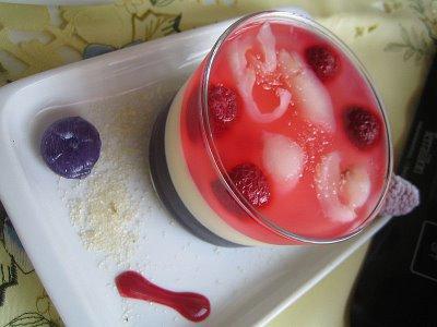Panna Cotta au chocolat blanc......emprisonnée entre une gelée de violettes , de roses , j'y ai glissé quelques framboises et despetits morceaux de litchis........!!