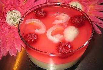 Panna Cotta au chocolat blanc......emprisonnée entre une gelée de violettes , de roses , j'y ai glissé quelques framboises et despetits morceaux de litchis........!!