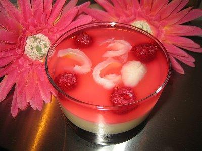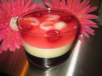 Tendresse, douceur, tout est réuni dans cette petite coupe pour réjouir vos papilles!!Une panna cotta au chocolat blanc emprisonnée entre une gelée de violettes et une gelée de rose!!!Laissez-vous emporter par chaque cuillerée et fermez les yeux!!Tout simplement envoûtant!!Pour votre marché:Gelée de violettes:-10 cl de sirop de violettes-10 cl d'eau-2 feuilles de gélatineGelée de roses et de litchis:-10 cl de jus de litchis-10 cl de sirop de roses-10 cl d'eau-3 feuilles de gélatinePanna Cotta:-20 cl de crème liquide-100 gr de chocolat blanc-2 feuilles de gélatine-des morceaux de litchis et quelques framboisesJ'ai mis mon tablier:GELEE DE VIOLETTES:*Mettre tremper les feuilles de gélatine dans de l'eau froide.*Faire chauffer l'eau et le sirop de violettes jusqu'à ébullition*Retirer du feu et faire dissoudre la gélatine.*Laisser refroidir à t° ambiante.*Remplir de jolies verrines jusqu'au 1/3*Mettre au frais 2 heuresPANNA COTTA:*Mettre tremper la gélatine.*Faire chauffer la crème liquide et y faire fondre le chocolat doucement.*Y dissoudre la gélatine .*Lorsque le mélange est refroidi, le verser sur la gelée de violette, et mettre eu frigo 2 heures.GELEE DE ROSES-LITCHIS*Procéder de la même façon qu'avec le sirop de violettes.Avant de couler la dernière couche, vérifier que le tout soit bien pris.*Disposer sur le chocolat des morceaux de litchees et quelques framboises avant de couler la gelée de roses et de litchis.Remettre 2 heures au frigo avant de déguster!!!Diablement bon!!!!!Bonne soirée!!