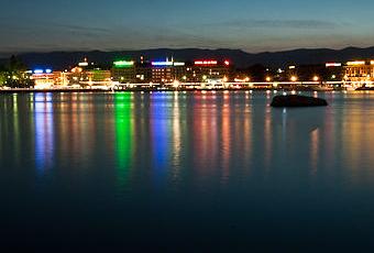 Une vue très classique by night de la rade de Genève avec en noir au milieu du lac la pierre du Niton. L’eau du lac Léman parait huileuse, ce phénomène est du temps au d’exposition de 30 secondes qui a fait disparaitre les vague rendu très lisse la surface du lac.