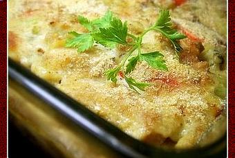 Aplanir la surface et verser uniformément la sauce béchamel. Saupoudrer avec la chapelure et enfourner à 180ºC jusqu'à ce que le plat soit bien doré. Retirer le plat du four et servir sans attendre.