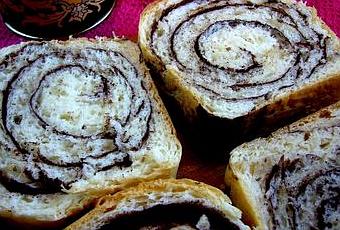 Après ses excellentes étoiles aux abricots, j' avais envie d'essayer une autre recette de Paprikas. (toujours pas de liens possible sur cet ordinateur...) Comme j'aime bien les brioches roulées avec une garniture, j'ai choisi de faire son pain de mie original: parfumé au cacao.
