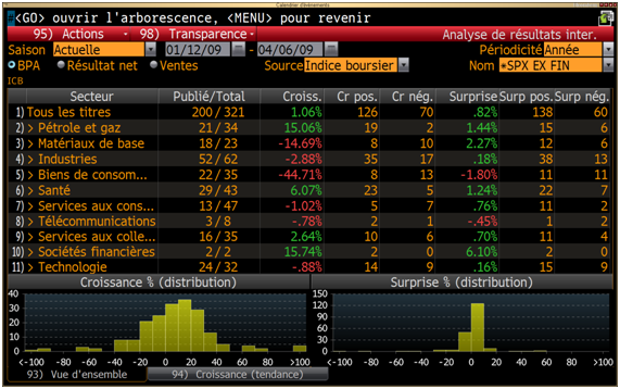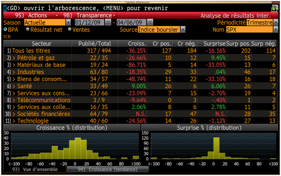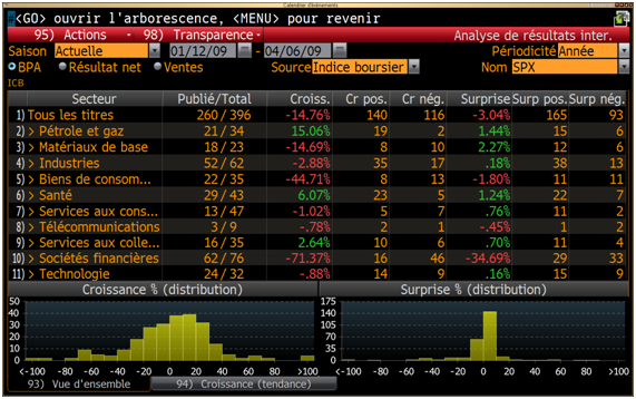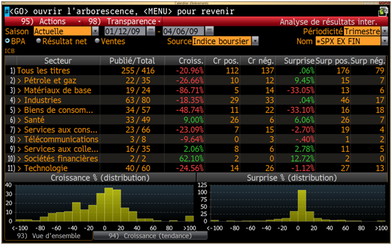 317 entreprises ont désormais publiées leurs résultats dans le S&P500. La croissance des bénéfices est globalement négative sauf pour le secteur de la santé et des services aux collectivités, en moyenne les bénéfices du S&P ont chutés de 36%. En excluant les financières, qui en passant affichent une baisse de plus de 230% de leurs bénéfices par apport au T4 2007, nous avons un recul moins prononcé de -21% pour les entreprises du S&P500. Les secteurs les plus touchés sont dans l'ordre, les matériaux de base, les biens de consommation, le secteur pétrole et gaz et les technologiques.