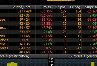 Le taux de surprise dans le S&P500 (financières incluse) est de -16%, cela indique que les analystes ont surestimés de 16% les publications de résultats. Hors financières le taux de surprise est positif de 0.06% indiquant que les analystes ont globalement vu juste sauf pour les sociétés financières. Globalement c'est donc plutôt comme attendu avec un gros « raté » pour les bancaires. Pour les bénéfices annuels, le taux de surprise est de -3% avec une croissance négative de -15% pour les 260 entreprises du S&P500 qui ont déjà publiées leurs résultats annuels.