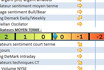 Un rallye est possible vers les résistances moyen terme citées ci-dessus mais il devrait être limité à ces niveaux avant une rechute. Une poussée vers ces niveaux serait une opportunité de vente. Tant que les acheteurs gardent le contrôle à court terme, on peut tenter des prises de positions sur les supports (de préférence vers le bas de la zone 3055/85) sachant que nous ne sommes pas encore trop surachetés. Cependant gardez à l'esprit qu'un de nos systèmes nous indique que le CAC future devrait clôturer sous 3109, ce niveau sera une résistance aujourd'hui.