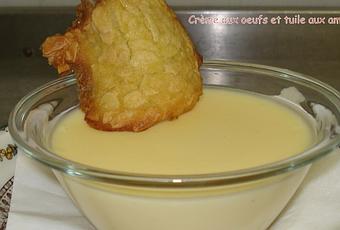 vanille et pendant ce temps on mélange au fouet les oeufs et le sucre, on verse le lait bouillant dessus sans arrêter de mélanger, on retire la 1/2 gousse, on place le tout dans des ramequins et au four (chaleur tournante) à 110°c 50mn, ou au bain marie puis au four traditionnel thermostat 3 ou 4 et pendant ce temps on fait des tuiles : 2 blancs d'oeufs, 60 gr de sucre, 60 gr de farine, 30 gr de beurre mou, une poignée d'amande effilé, mélanger le tout et disposer en petits tas que l'on étale bien à la fourchette sur une plaque de cuisson recouverte d'un papier sulfurisé on fait cuire à four chaud 3 à 6 mn, les tuiles sont cuite quand le bord commence à dorer, sortir du four et poser sur un petit rouleau à pâtisserie quelques minute le temps de refroidir (le mieux étant bien sur d'avoir une tôle ondulé spécial tuiles, il suffit alors de les déposer dans les courbe de la tôle et de laisser refroidir), décorer vos crème avec ces tuiles et bon appétit.