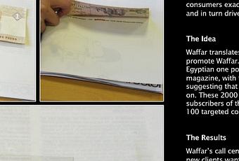 La pub du jour montre qu’il faut être concret pour attirer ses prospects. En effet le site egyptien www.waffar.com qui a pour objectif d’ouvrir des bons plans et des réductions à ses visiteurs à eu la bonne idée d’inclure dans 2000 magazine un vrai billet d’une livre égyptienne… Le résultat ne s’est pas fait attendre : +26% de visites, +18% de notoriété spontanée… et des annonceurs qui appellent spontanément !