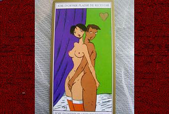 Les cartes sont illustrées de situations plutot colorées, ludiques, et très suggestives (façon Kama-sutra) - pour tous les fantasmes - avec un lexique plein d'humour, parfois romantique, parfois très cru ("le sourire de la pipe masquée, "la face cachée de la lune", "un petit doigt dans le cul", "entre mes seins"...).
