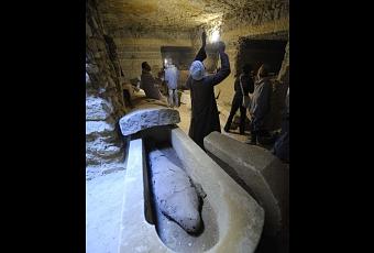 Saqqara, Egypte - L'équipe d'égyptologues dirigée par le Dr. Zahi Hawass a mis au jour un tombeau abritant une trentaine de momies vieilles d'environ 2 600 ans. Un véritable trésor archéologique.