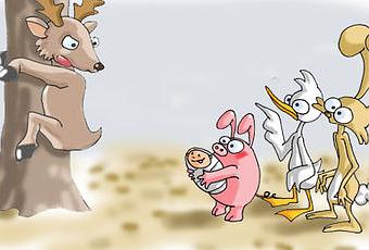 Pendant ce temps , dans la forêt proche , toujours accroché à son arbre commence à s'impatienter un pauvre renne .Intrigué par cet étrange spectacle , un drôle de trio affublé d'un bébé s'approche prudemment : " - Euuuh , bonjour commence le cochon , on peut vous aider ? " "- Vous pouvez en effet rappeler à deux petites filles et deux doudous que ça fait plus d'un mois que je les attend pour terminer une histoire , leur répond avec véhémence le cervidé " " - Pas de problème , interrompt le canard , on a juste un bébé à déposer à Avignon et on revient tout de suite prévenir qui vous voulez "....puis il ajoute dans un chuchotement à ses compagnons : " Venez ! venez ! Ne nous attardons pas auprès de cet énergumène !! Il croit au père noël si il pense qu'on a que ça à faire à chercher des petites gamines qui en plus sont sûrement parties en vacances "...Mais d'où viennent donc ces improbables personnages avec cet adorable petit poupon ?? Pour le savoir , il faudra cliquer sur l'image suivante :