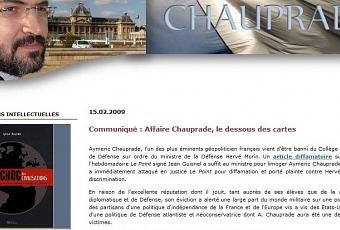 Aymeric Chauprade, l'un des plus éminents géopoliticien français vient d'être banni du Collège Interarmées de Défense sur ordre du ministre de la Défense Hervé Morin. Un article diffamatoire sur le site de l'hebdomadaire Le Point signé Jean Guisnel a suffit au ministre pour limoger Aymeric Chauprade. Ce dernier a immédiatement attaqué en justice Le Point pour diffamation et porté plainte contre Hervé Morin pour discrimination.