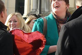 ou des fleurs a la main et se regarder avec connivence. A 2.22 pm, une trentaine de personnes se sont echangés cartes, fleurs, bouquets en forme de coeur et meme choux fleur (car dans choux
