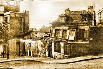 Le Bateau-Lavoir Construit sur les ruines d'une guinguette : "Le Poirier sans Pareil", après l'achat, lors de la confiscation des biens du domaine des Dames de Montmartre. La construction, consistait à l'installation dans les branches d'un arbre, de quelques chaises autour de tables. Le tout, arbre compris s'éffondra en 1830 en raison du morceau de gruyère qu'était devenu le sous-sol pour l'ouvertures de galeries servant à extraire le gypse. En 1867 un propiétaire du nom de Thibouville, fit construire, sans autorisation, sur des plans de l'architecte Vasseur des ateliers d'artiste. L'endroit fut occupé par un marchand de fourrures canadien, c'est pour cela qu'il prit le nom de "La Maison du Trappeur" encore en usage en 1900.. C'était un enchevètrement de verrières de poutres de rondins de bois, où la fantaisie de l'architecte avait créé de mystérieuses oubliettes qui donnait une allure déglinguée aux ateliers. Dès 1887, ce fut un reoaire d'anarchistes, jusqu'à ce que une descente de police ne disperse toce petit monde. Ce sont ensuite les symbolistes qui envahirent lmes lieux. Gauguin, à son premier retour de polynésie y rendit visite à M&auffra et Pacco Durio. C'est ce Durrio qui attira les artistes espagnols sans le sou, tel Canals en 1901, et un certain Pablo Ruiz en 1904. L'entrée du 13 rue Ravignan donnait dans le dernier étage de la maison. Un escalier permettait de descendre trois étages pour déboucher rue Garreau, ce qui fait qu'il pouvait prétendre habiter à la fois le deuxième étage, et le premier sous-sol. Yadwrigha, "l'institutrice polonaise" Ce tableau fut découvert par Picasso rue des Martyrs, en face du cirque Médrano chez un marchand de literie et matelas "le Père Soulié" ....... Rien ne fut vraiment prémédité dans ce banquet. Il n'y eut aucun débordement, ni scandale public. Si cette fête prit de telles proportions, c'est en raison de la qualité des convives dans la maison du 13 rue Ravignan qui fut appelée d'abord "la Ferme", ensuite "La Maison du Trappeur" (quand Picasso y emménagea) "le Bateau-Lavoir", enfin "l'immeuble au chiqué" en raison de tournages cinématographiques. Jamais une compagnie ne voulut assurer contre l'incendie ce hangar de ferme soutenu par des poutres de bois imposantes. Transformé en atelier d'artistes, l'endroit fut d'abord occupé par Maxime Mauffra (qui y reçut Paul Gauguin), puis par André Salmon, Picasso, Van Dongen, Max Jacob.La compagne de Picasso à l’époque, Fernande Olivier nous en donne un aperçu :
