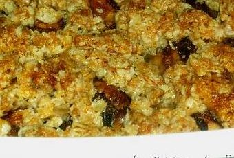 Pour la pâte à crumble, mélangez les flocons d'avoine, le parmesan, et le beurre coupez en morceaux, du bout des doigts. Puis émiettez la sur le mélange précédent.