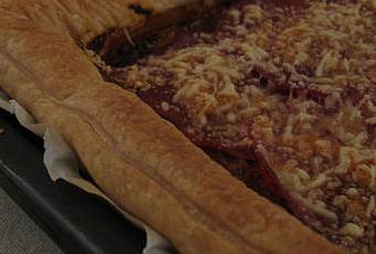 Tartinez en votre pâte feuilletée avant de déposer les tranches de bacon et de saupoudrez de gruyère râpé.