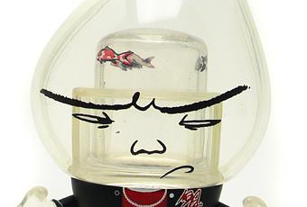 NYNO a essayé de nous pousser dans nos derniers retranchements, et il a eu raison le bougre ! En tout cas ses propositions graphiques ont nécessité le développement de techniques secrètes de production. Son personnage, basé sur le ELEMENTS EAU a un peu la tête comme un aquarium. Les carpes Koi que vous voyez sont imprimées à l’intérieur de la figurine, sur la base transparente qui sert d’ossature (ni clou, ni vis, ni colle). Sa signature sur le dos de son blouson parodie un logo fameux. Les mains sont elles aussi transparentes, tout comme la tronche du perso.