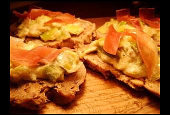 3. Tartiner les tranches de pain de fondant de poireaux et déposer quelques lanières de jambon cru dessus.