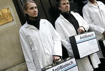 Les membres de ces gouvernements semblent touchés par la Monsantoïte aïgue dont les symptômes incluent une perte de mémoire relative au principe de précaution et des délires chroniques conduisant à penser que la protection des intérêts des citoyens européens pourrait être assurée par la protection des intérêts privés des sociétés agro-chimiques… Les sujets contaminés deviennent hautement perméables aux arguments de ces firmes, notamment lors des prises de décision relatives aux OGM. Pour y remédier, l’équipe médicale de Greenpeace s’est rendue ce mercredi 25 février aux ambassades d’Italie, d’Espagne, d’Allemagne, de Roumanie et de Slovaquie et y ont distribué des boites d’AntiBiotech.