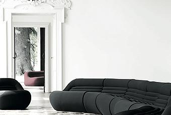 Un petit zoom sur Carrera, une ré-édition de la création originale datant de 1969 dessinée par De Pas, D’Urbino, Lomazzi. Des éléments modulaires aux formes variables permettant de composer des ensembles courbes ou sinusoïdaux qui donnent toute la dimension hors du commun de ce canapé, le tout accompagné de fauteuils dans le même ton. Délicieusement vintage avec son allure Sci-fi oldschool, à mi-chemin entre Cosmos99 et 2001, il est recouvert d’un tissu noir stretch très réussi qui lui donne un côté actuel. Très attirant.