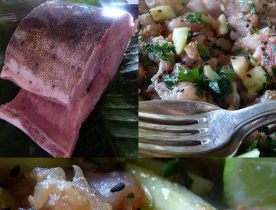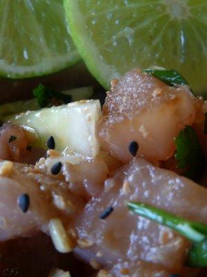 Un morceau de dorade coryphène, 3 cives coupées finement, Persil plat ciselé, le jus d'un citron vert, 3 c à soupe de sauce soja japonaise (plus douce, plus sucrée), Gomasio ( à défaut de sésame doré que je n'ai plus...), Bois d'Inde, Sésame noir. Ajouter un concombre couper en petits dés.