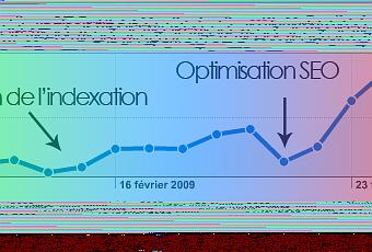 On voit nettement les montées et les descentes en début de qui correspond au trafic apporté par les blogs ayant publié un lien vers les sites puis une grosse chute qui correspond à la date où aucun nouveau billet n'est paru ailleurs. Et c'est à ce moment que les visites sont apportées par Google, et la courbe des visites montre bien une progression positive régulière qui coïncide avec l'optimisation et le positionnement croissant dans le moteur de recherche...