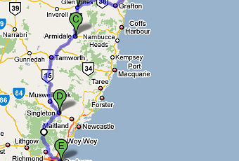 Donc en quittant la côte Pacifique Jeudi matin, nous sommes partis vers l'Ouest pour effleurer la "Great Dividing Range", une chaîne de montagne qui courre du Queensland au Nord, à la Tasmanie au Sud. Collines, montagnes. Le point culminant est le Kosciuszko (2.100 m). Tiens, des Kosciuszko ici aussi. Mais il n'est pas Morizet celui-là. Et nous avons rejoint la ville de Glen Innes (voir notre itinéraire sur la Google Maps).