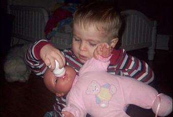 C'est mon filleul qui nourit ''tendrement'' la poupée de ma fille!!! En voit vraiment le petit coté masculin en lui!!! C'est un amour ce petit coeur!! Ils à 2 semaines de plus que ma fille...c'est trop beau de les voirs jouer ensembles!