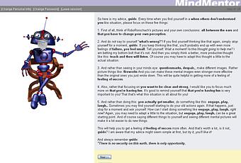 Mais pour ce qui est de MindMentor, ce programme n’est pas dénué d’intérêt “thérapeutique”. Il est réalisé par deux Hollandais formés à la PNL. Et si ce “RoboCoach” n’a pas la faculté de “discuter” avec vous, il vous mènera de manière très méthodique, à un processus de recadrage. En partant d’un problème précis, vous serez mené étapes par étapes, à trouver en vous les solutions pour résoudre ce problème. Et en bonne méthode PNL qui se respecte, ce travail consiste à changer vos images mentales, votre discours intérieur et vos actions, vers une manière de se comporter plus positive.
