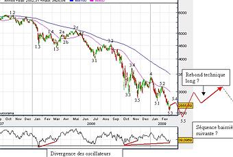 Selon ce décompte à mon avis le plus probable, nous approchons actuellement de la fin de la vague 5 : Il reste à faire la 5.4 (petit rebond technique) et la 5.5 baissière, qui cloturerait une première grande séquence baissière (qui a débuté à l'été 2007 sur le CAC), et pourrait être suivie par un rebond technique plus long et/ou plus marqué que les précédents (on est à un degré fractal au dessus des autres rebonds).